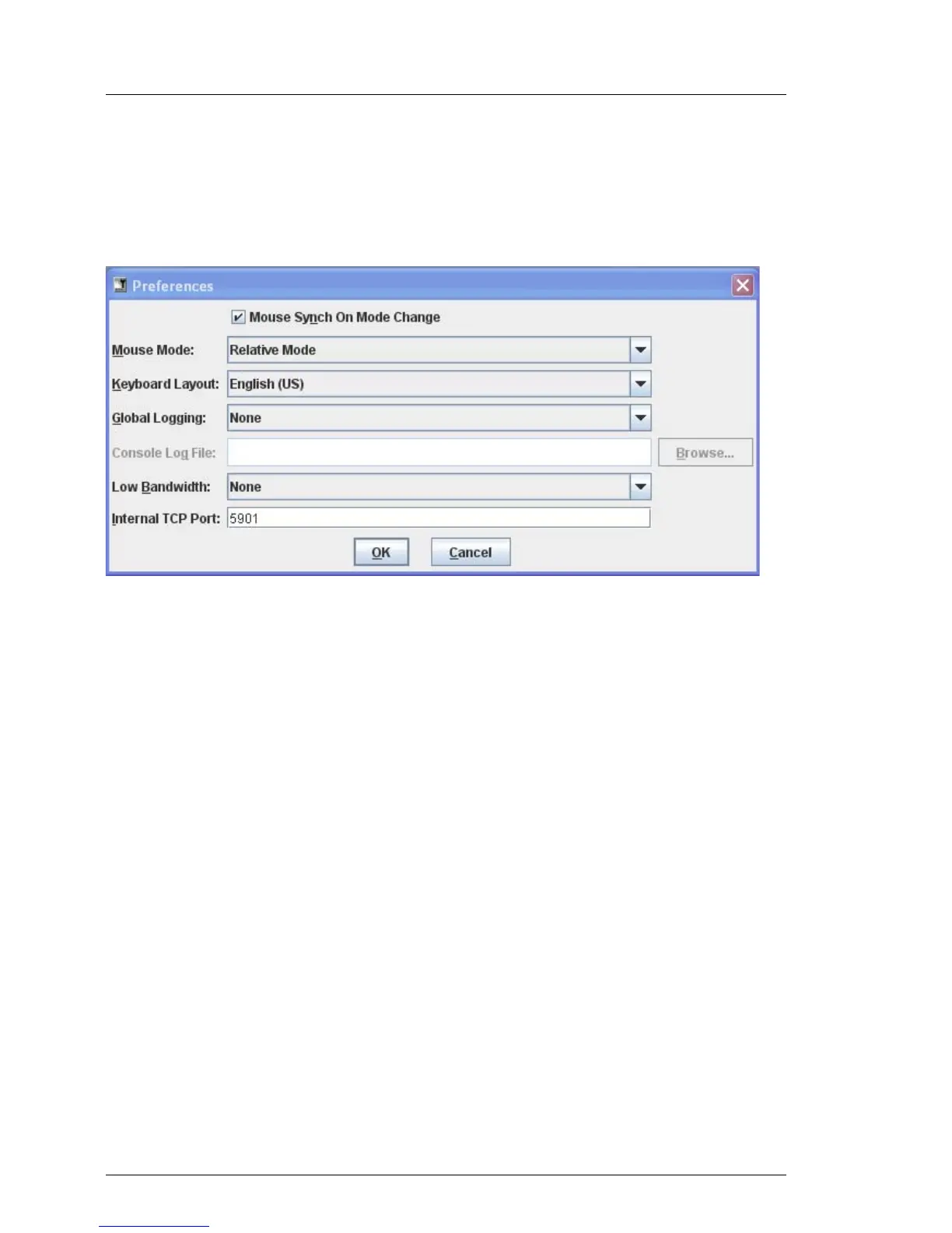 The Preferences menu allows you to configure the mouse mode, keyboard layout,
