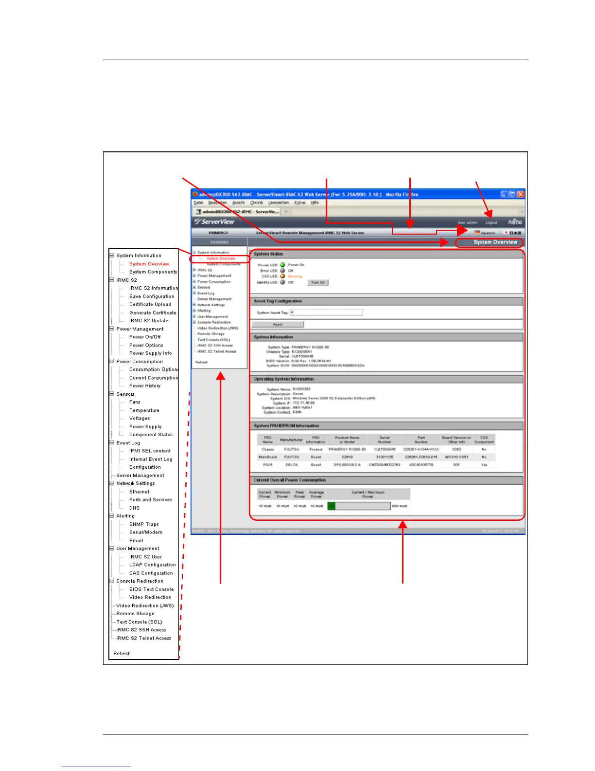The iRMC S2/S3 web interface is structured as follows:
