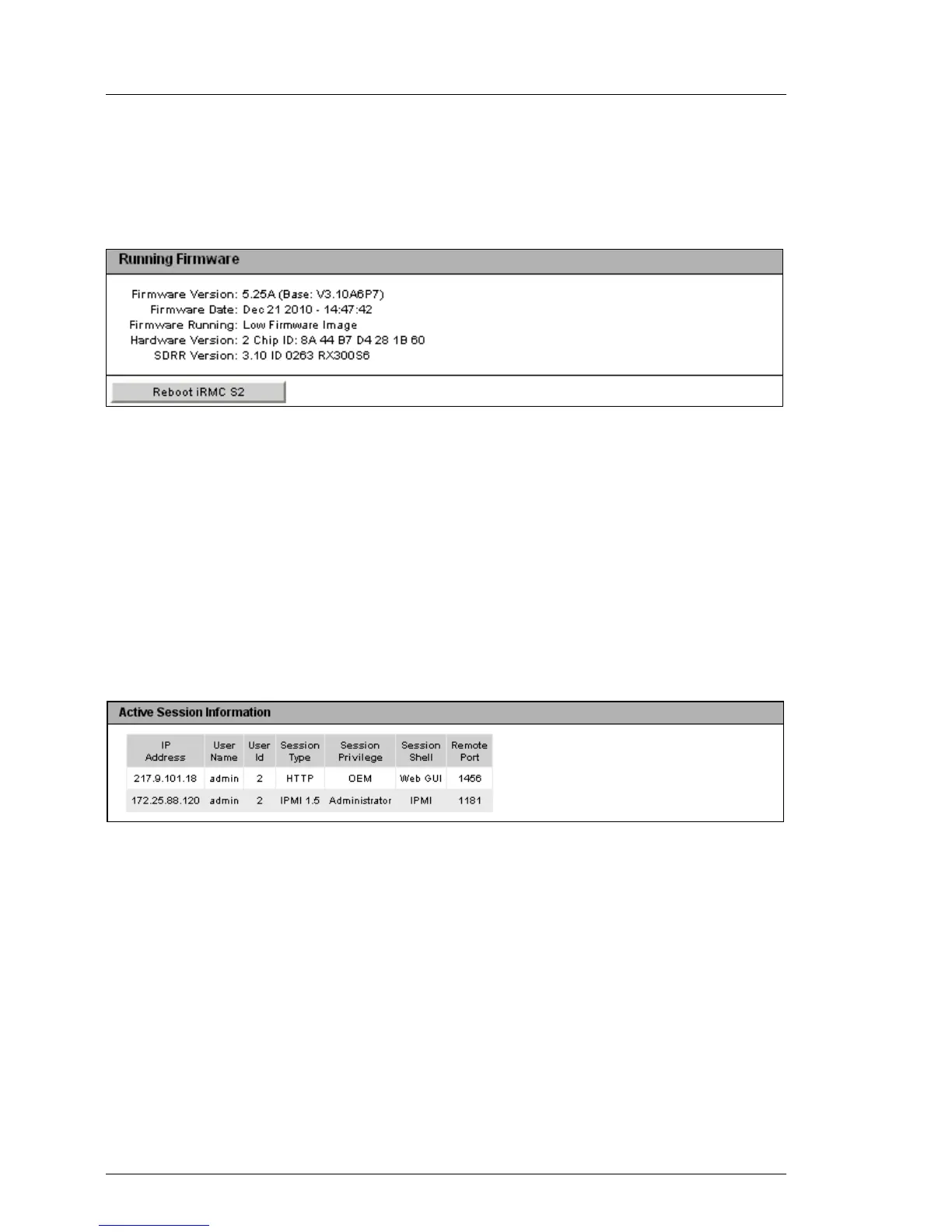 Figure 83: iRMC S2/S3 Information page - Firmware Information and iRMC S2/S3 reboot