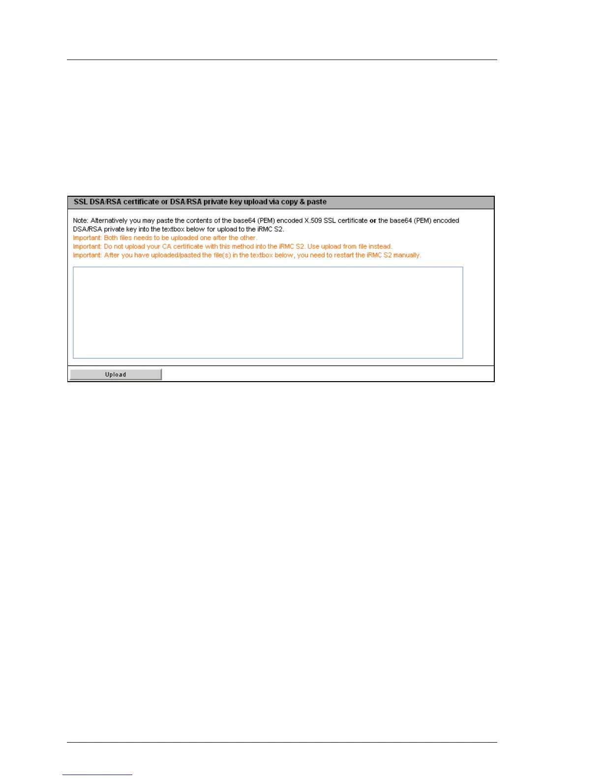 Ê Click Upload to load the certificate or the private key onto the iRMC S2/S3.