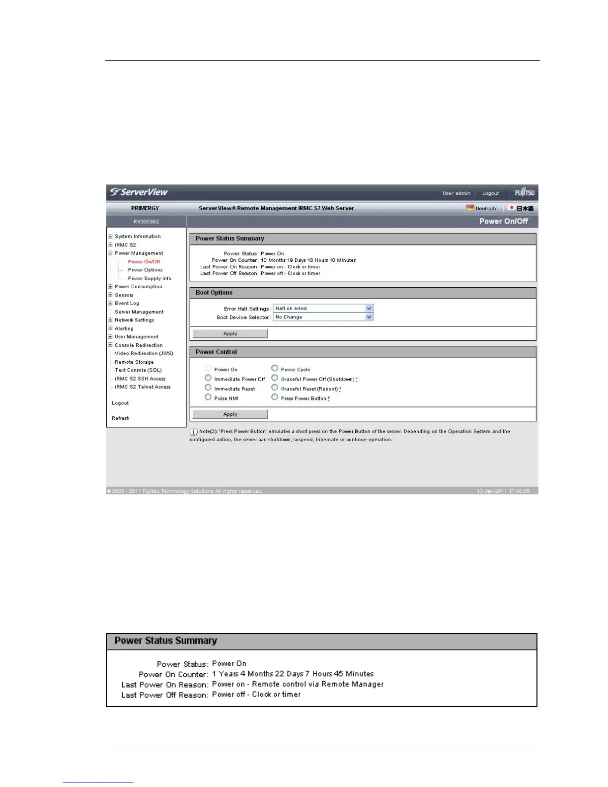 Figure 100: Power On/Off page - Power Status Summary