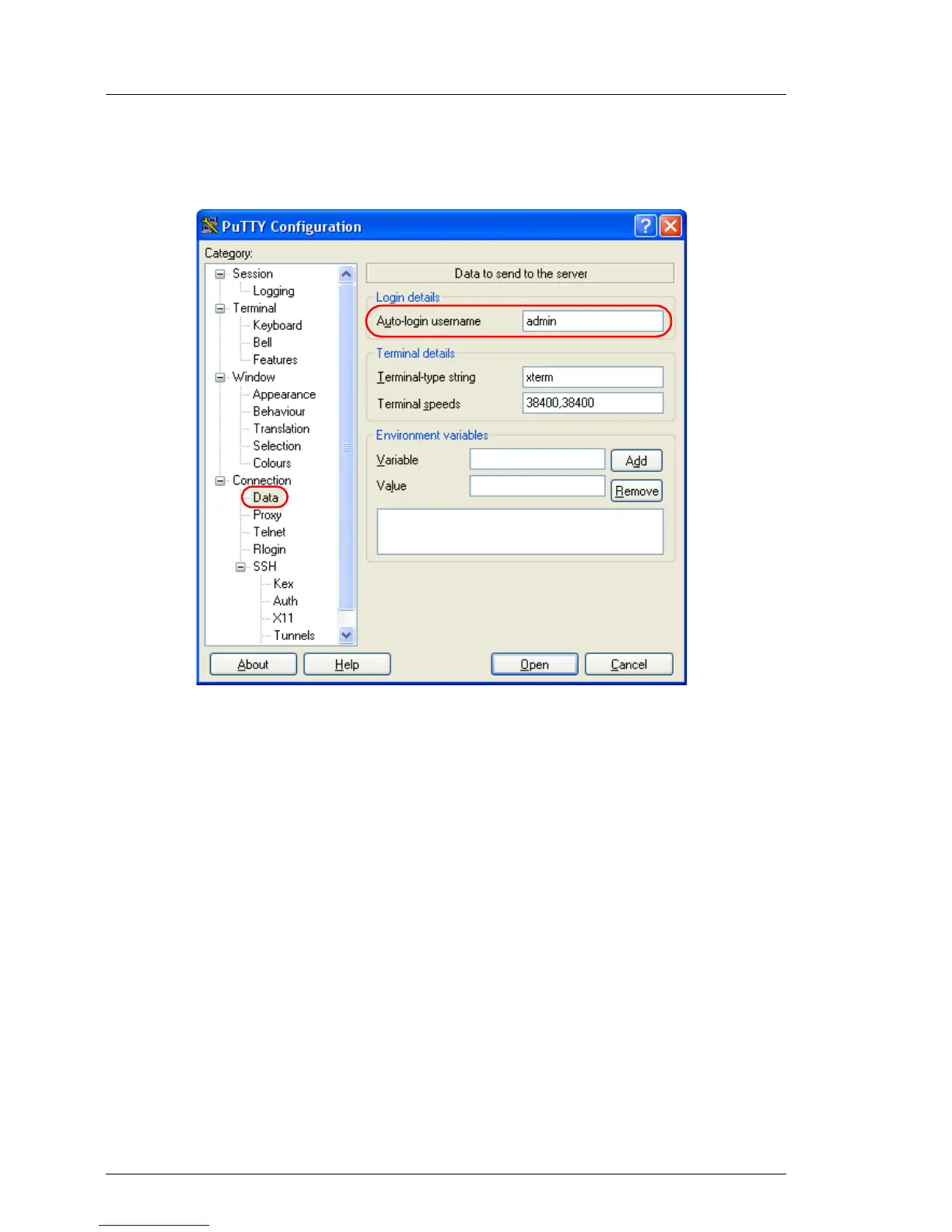 Bild 28: PuTTY: Specifying the user name for automatically logging into the iRMC