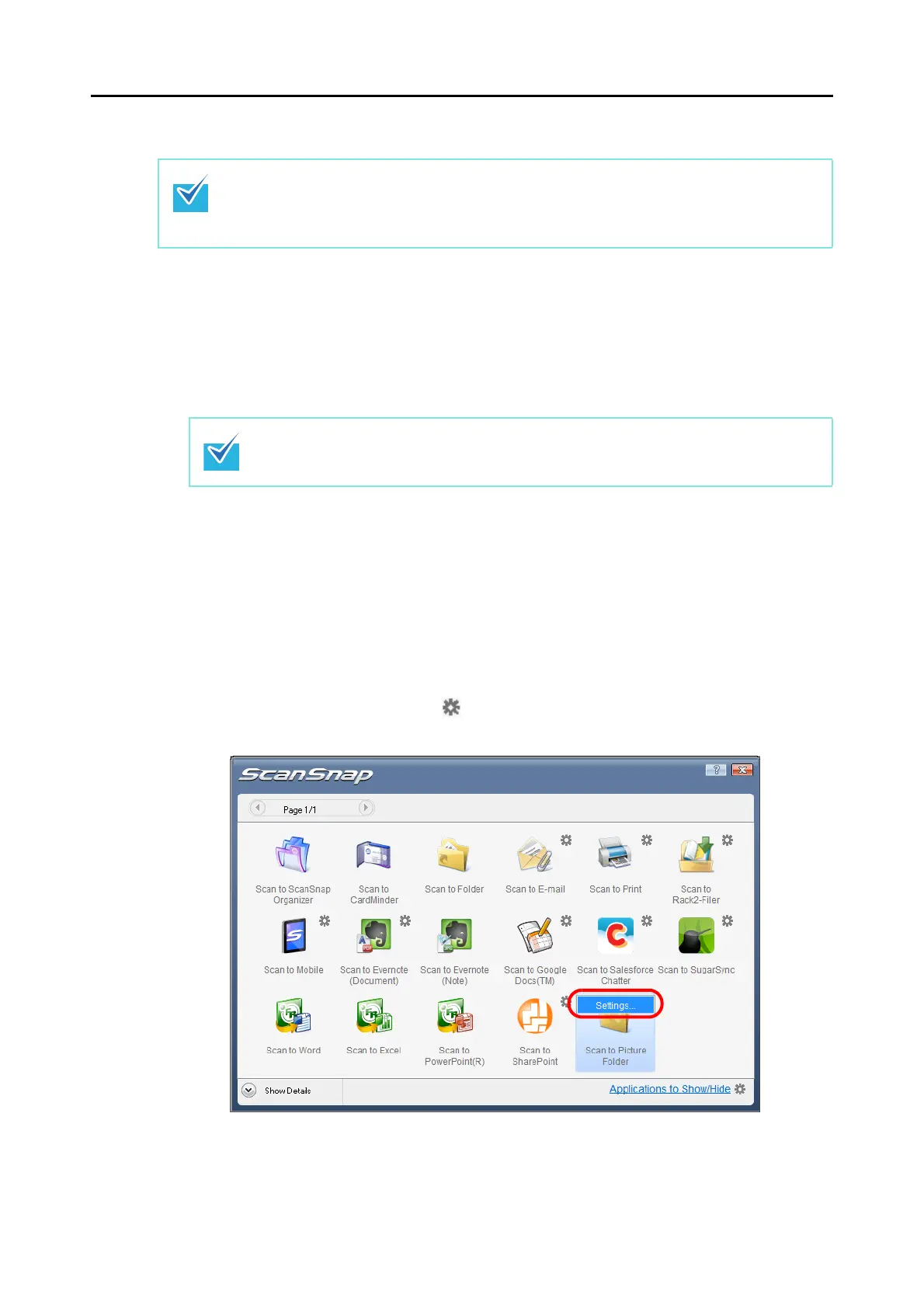 1. Move the mouse cursor to the mark on the [Scan to Picture Folder] icon, and then
