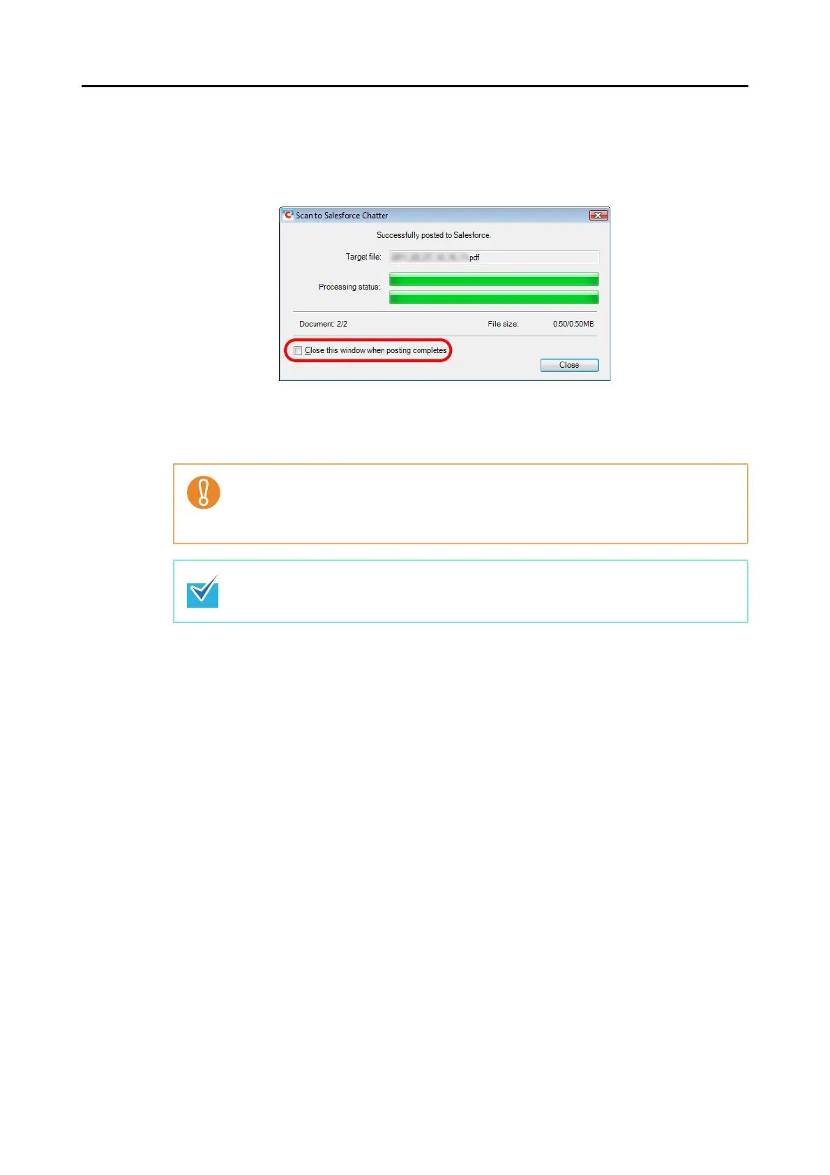 [Scan to Salesforce Chatter] dialog box will automatically close from next scanning