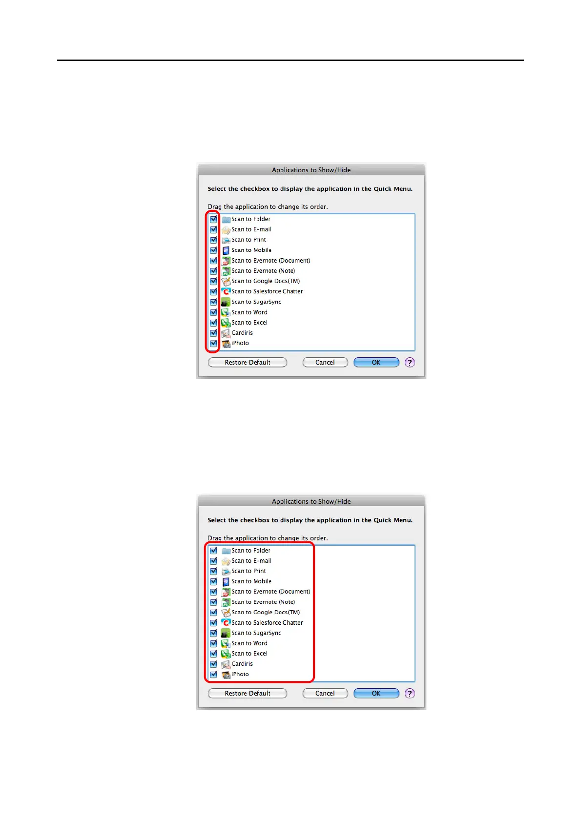 To display all the applications in the Quick Menu, click the [Restore Default] button.