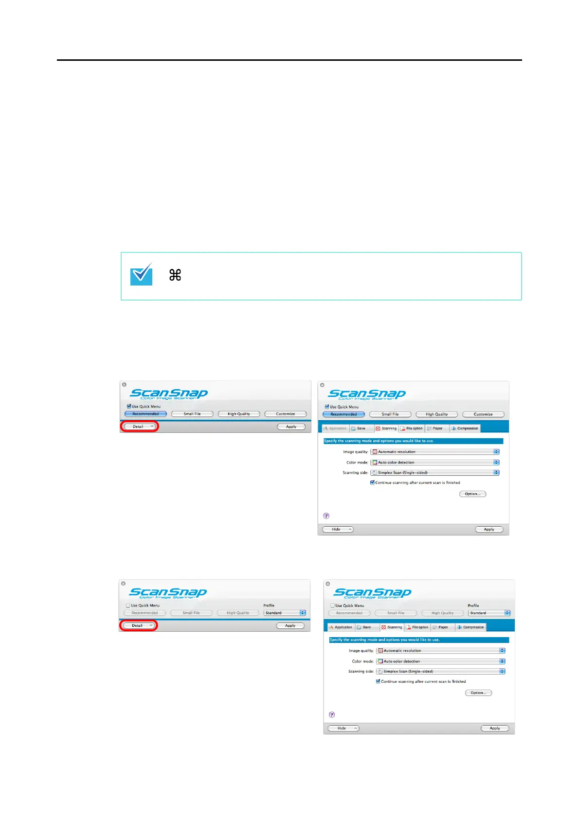 You can configure scan settings in the ScanSnap setup window depending on your intended