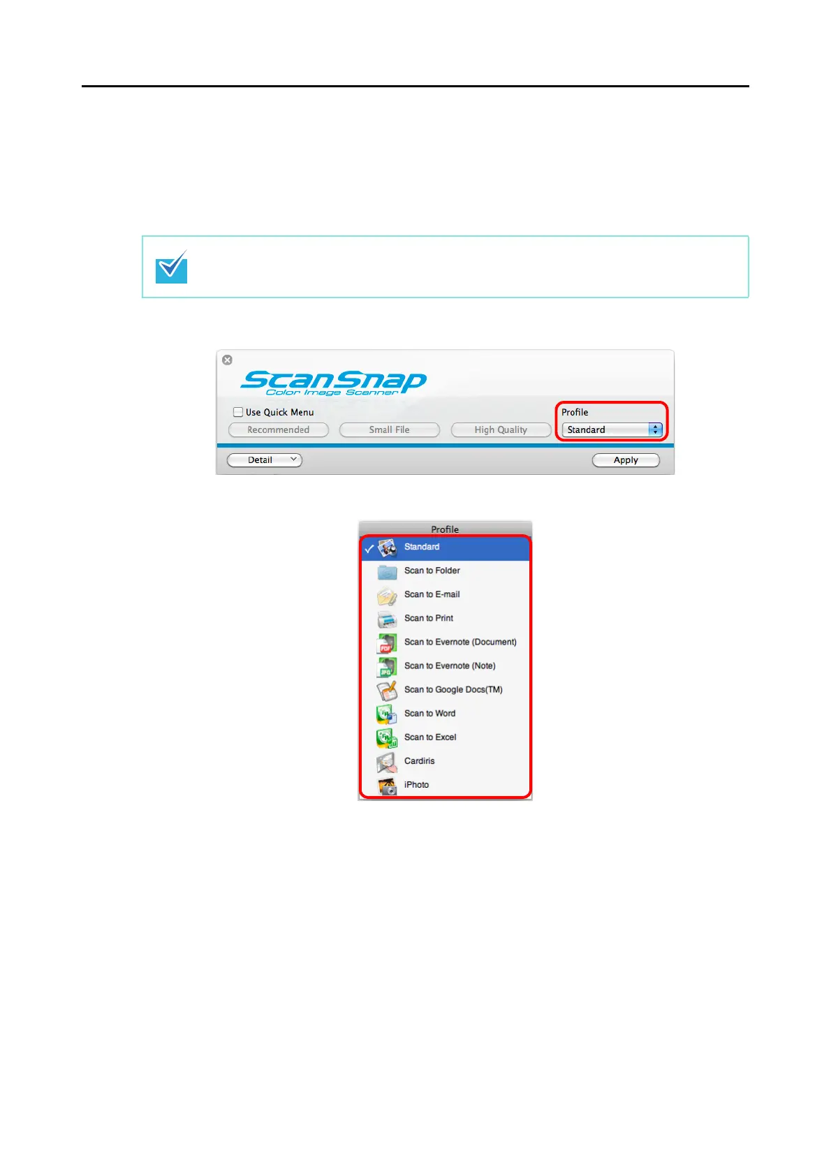 You can select a profile in the [Profile] pop-up menu in the ScanSnap setup window or from