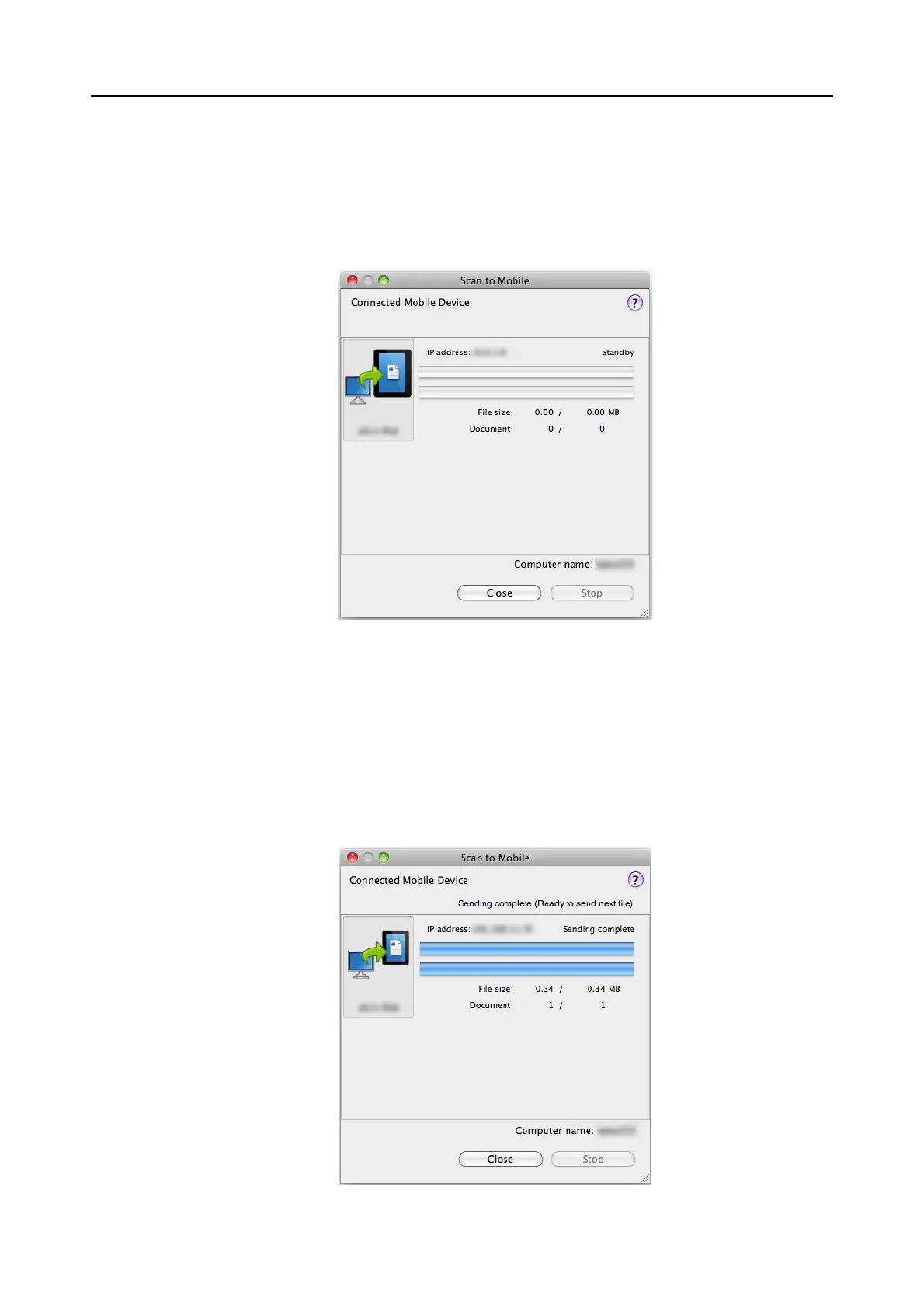 D When the connection is established, the [Scan to Mobile] window appears showing