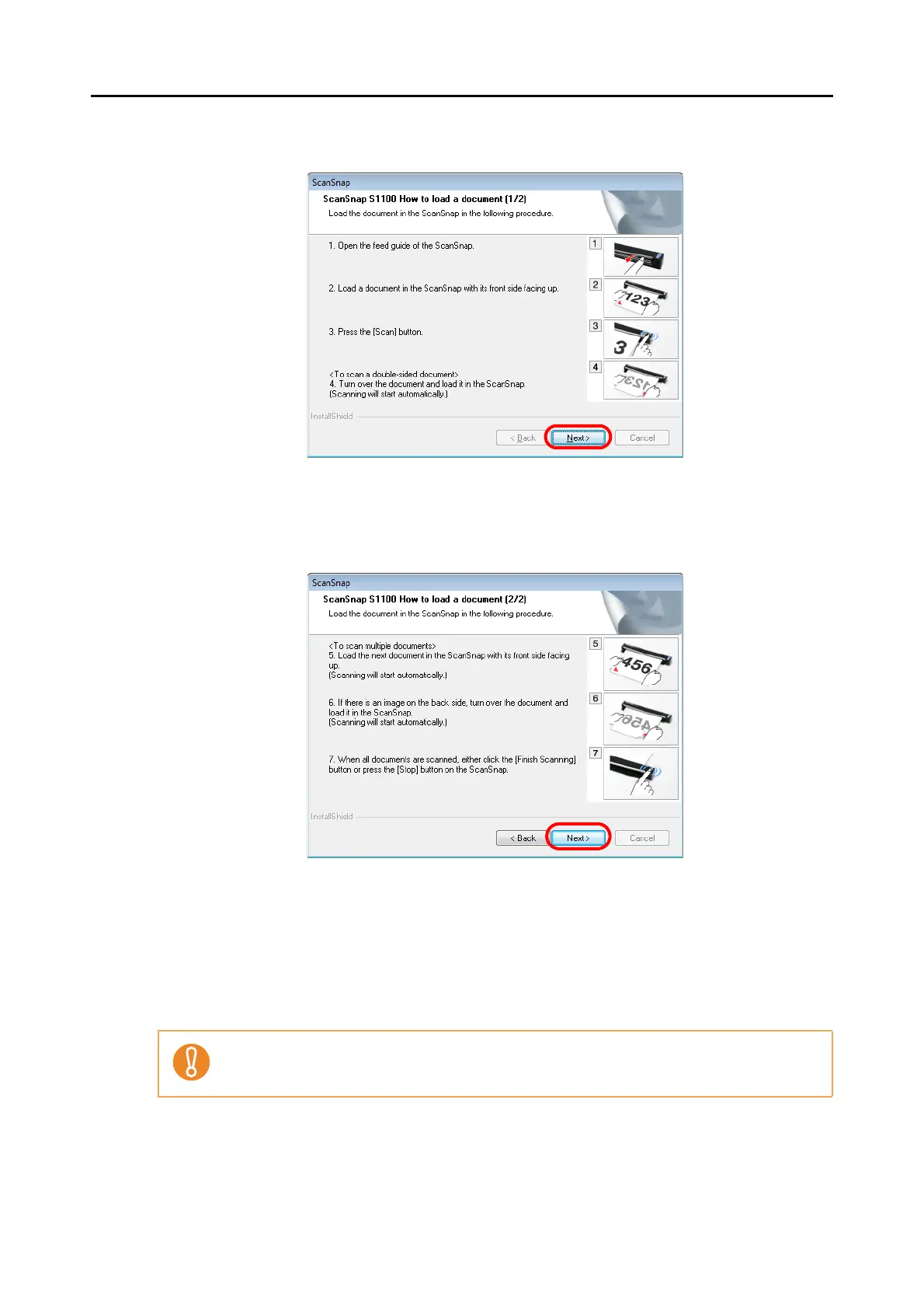 D The [ScanSnap S1100 How to load a document (2/2)] screen appears.