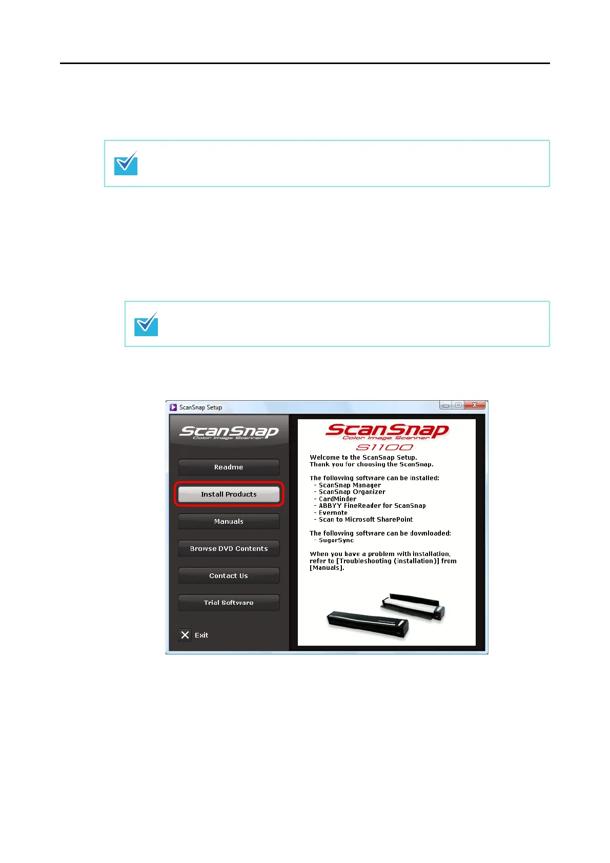 If the [ScanSnap Setup] dialog box does not appear, double-click "ScanSnap.exe" in the