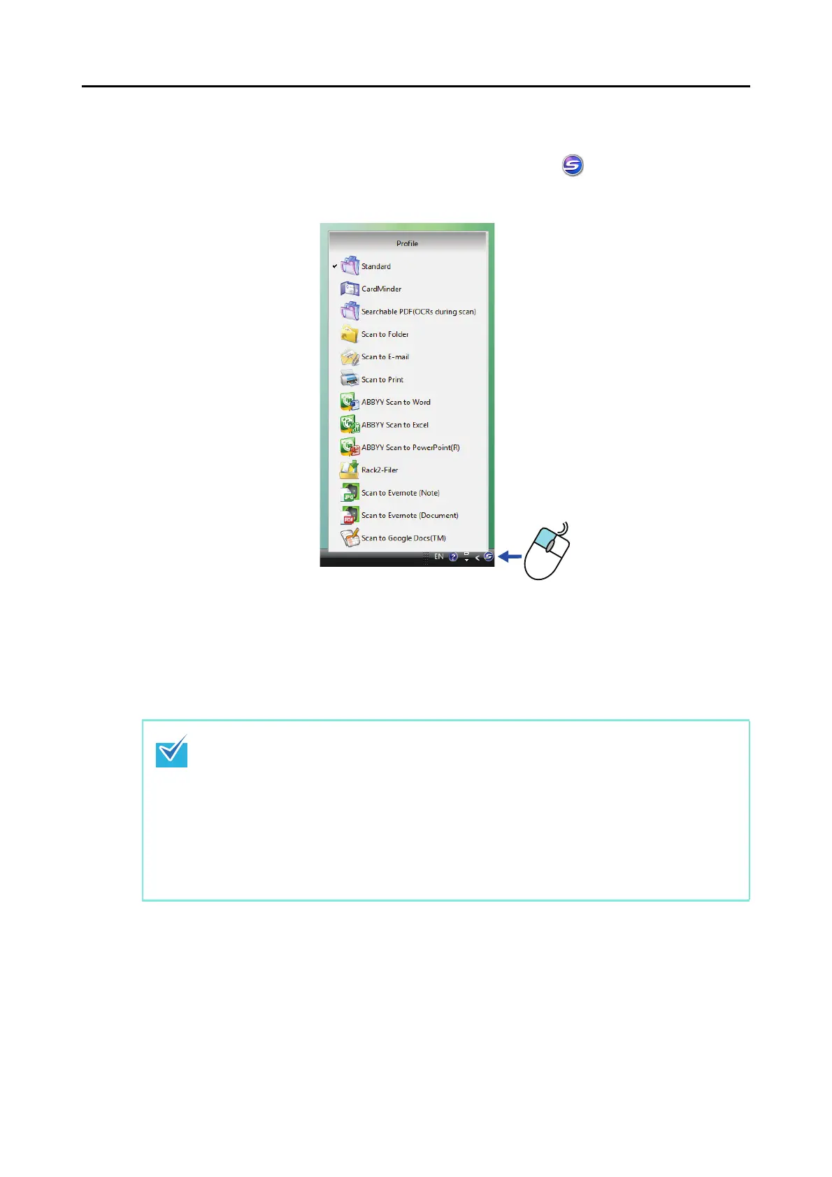 Select a profile in the Left-Click Menu before you perform scanning. Documents are scanned