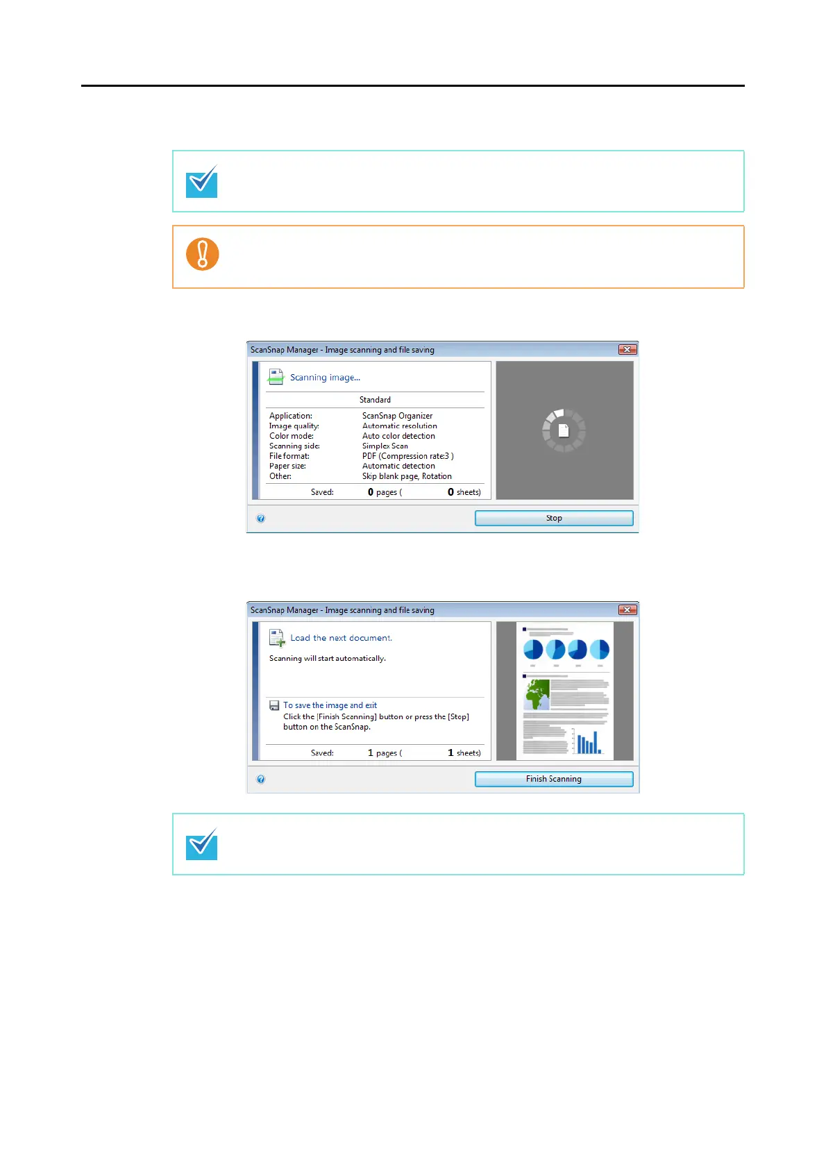 Load another document in the ScanSnap when you want to scan multiple sheets. Scanning