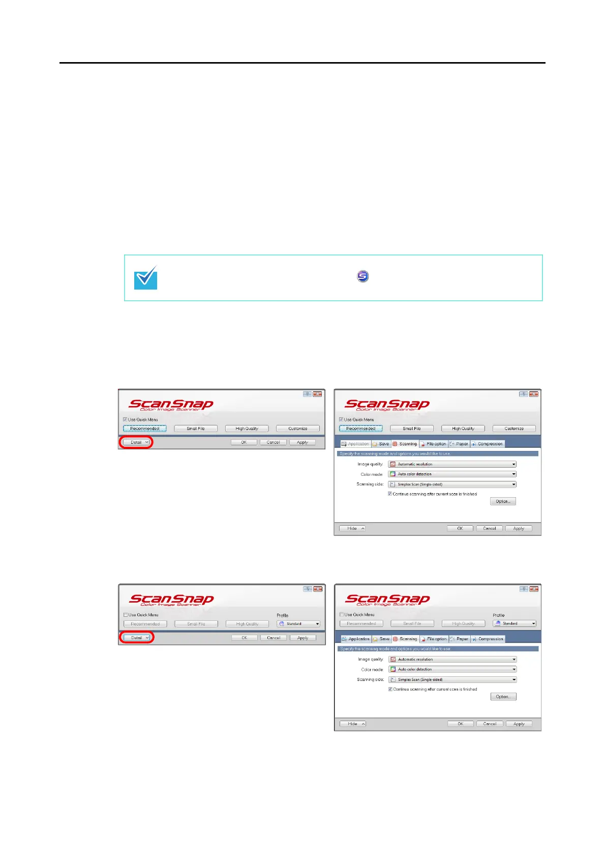 You can configure scan settings in the ScanSnap setup dialog box depending on your