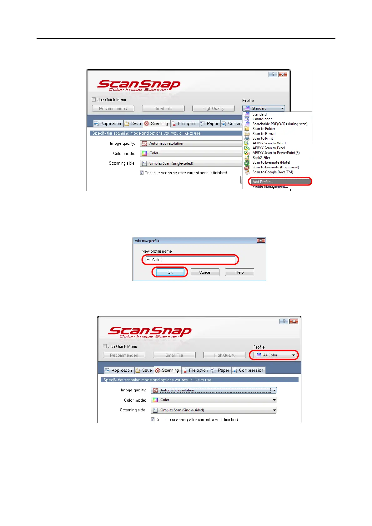 D The added profile appears in the [Profile] drop-down list in the ScanSnap setup