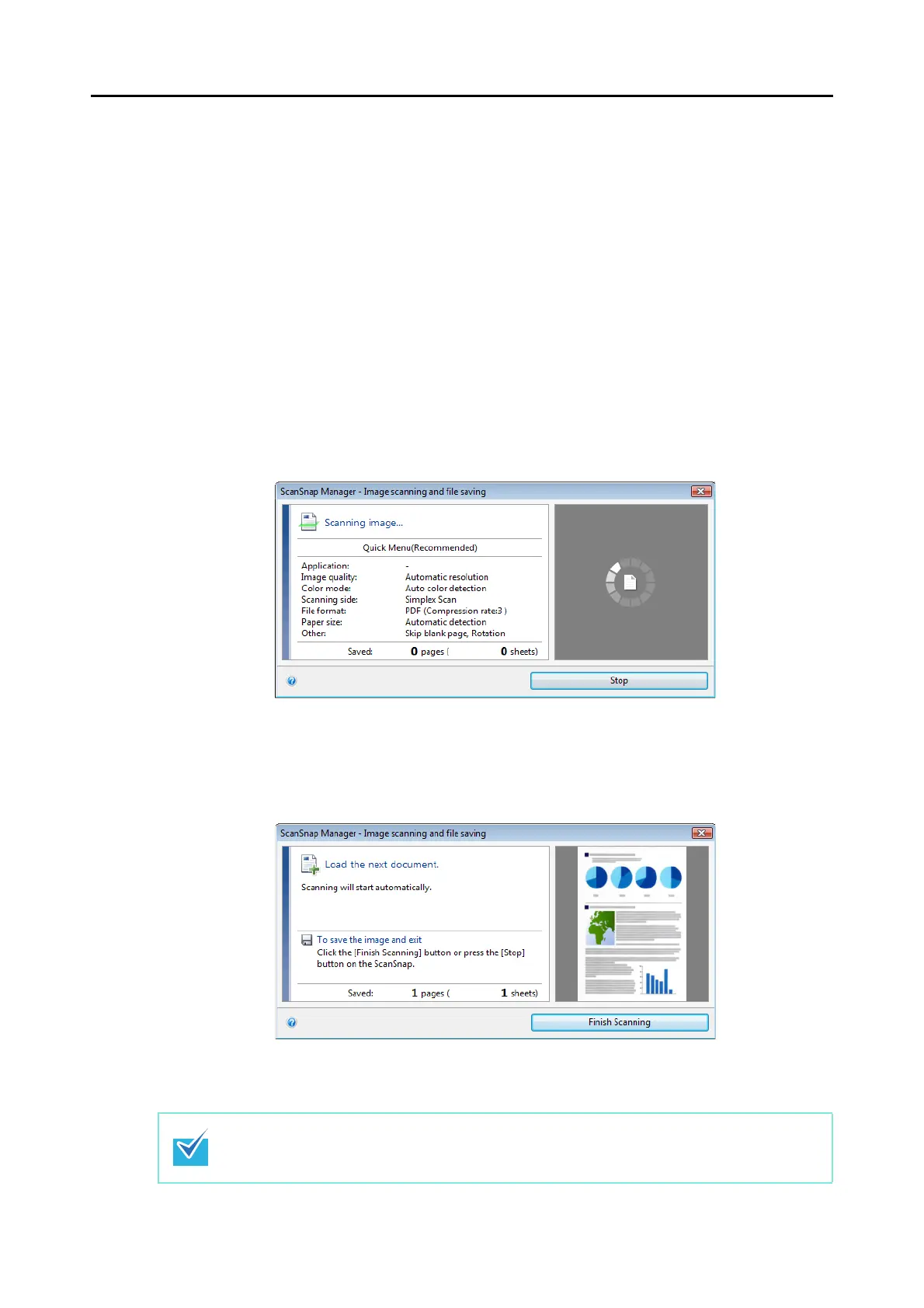 Also, note that you can stop scanning by clicking the [Stop] button in the [ScanSnap Manager