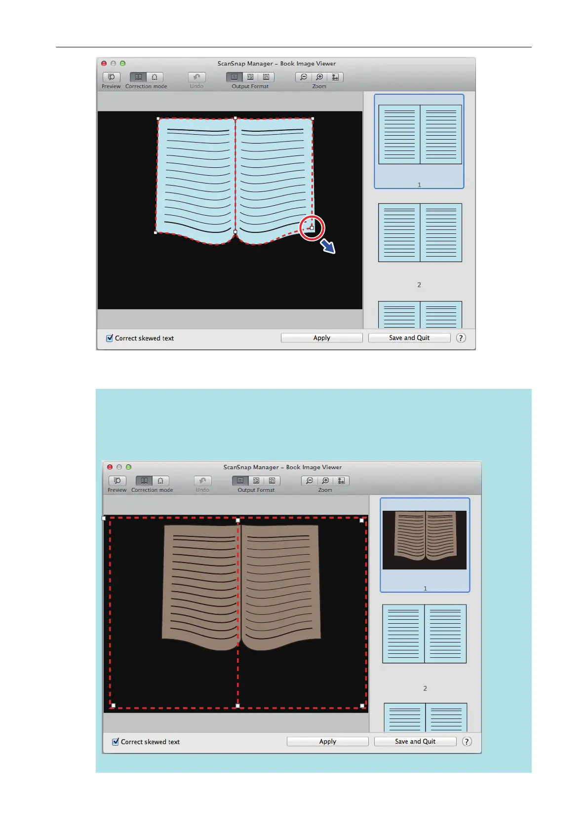 If the outline of the book is not aligned with the shape of the book in the scanned image, drag