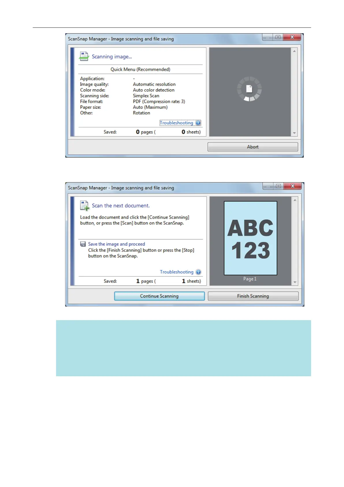l Clicking the [Continue Scanning] button in the [ScanSnap Manager - Image scanning and file