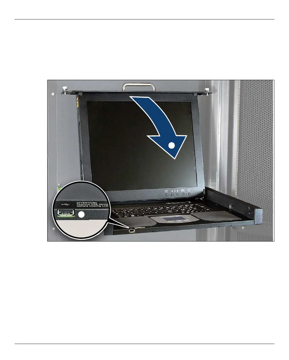 Ê Use the handle (2) to push the cover of the Rack Console carefully down until it clicks