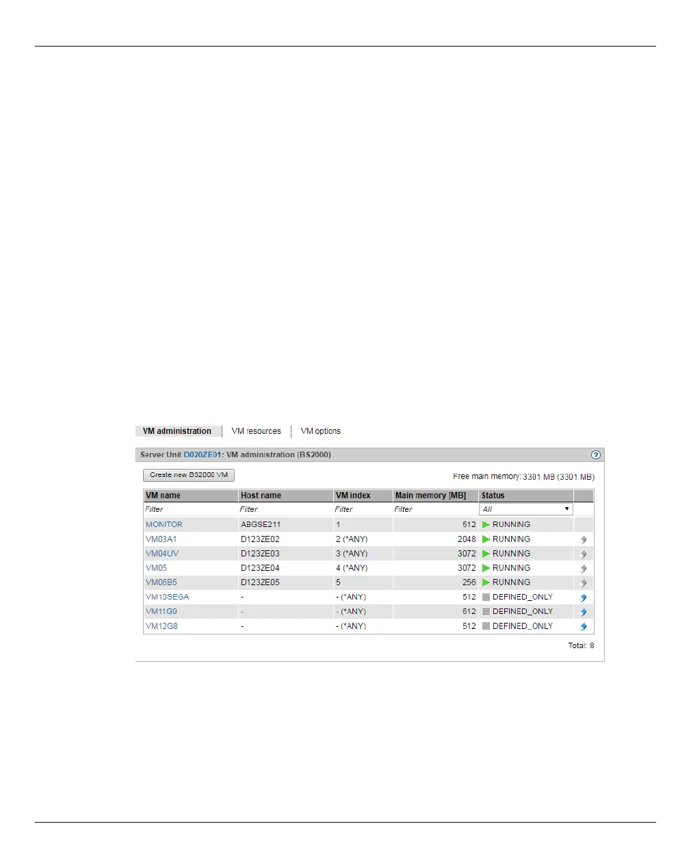 The VM administration tab displays the list of all the unit's BS2000 VMs.