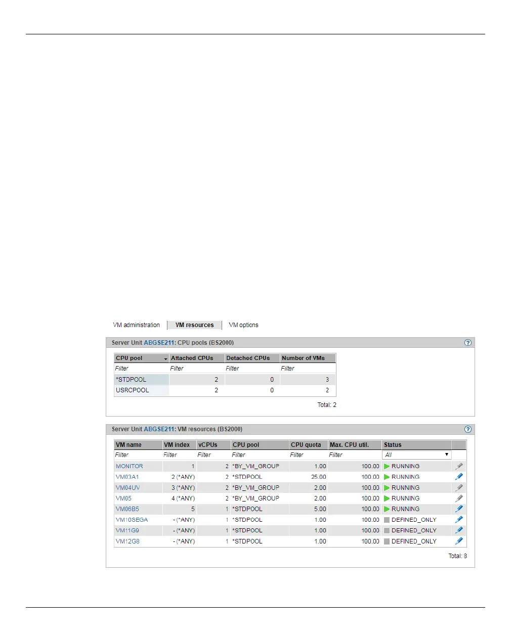 You manage the VM resources of the BS2000 VMs using the VM resources tab. You can