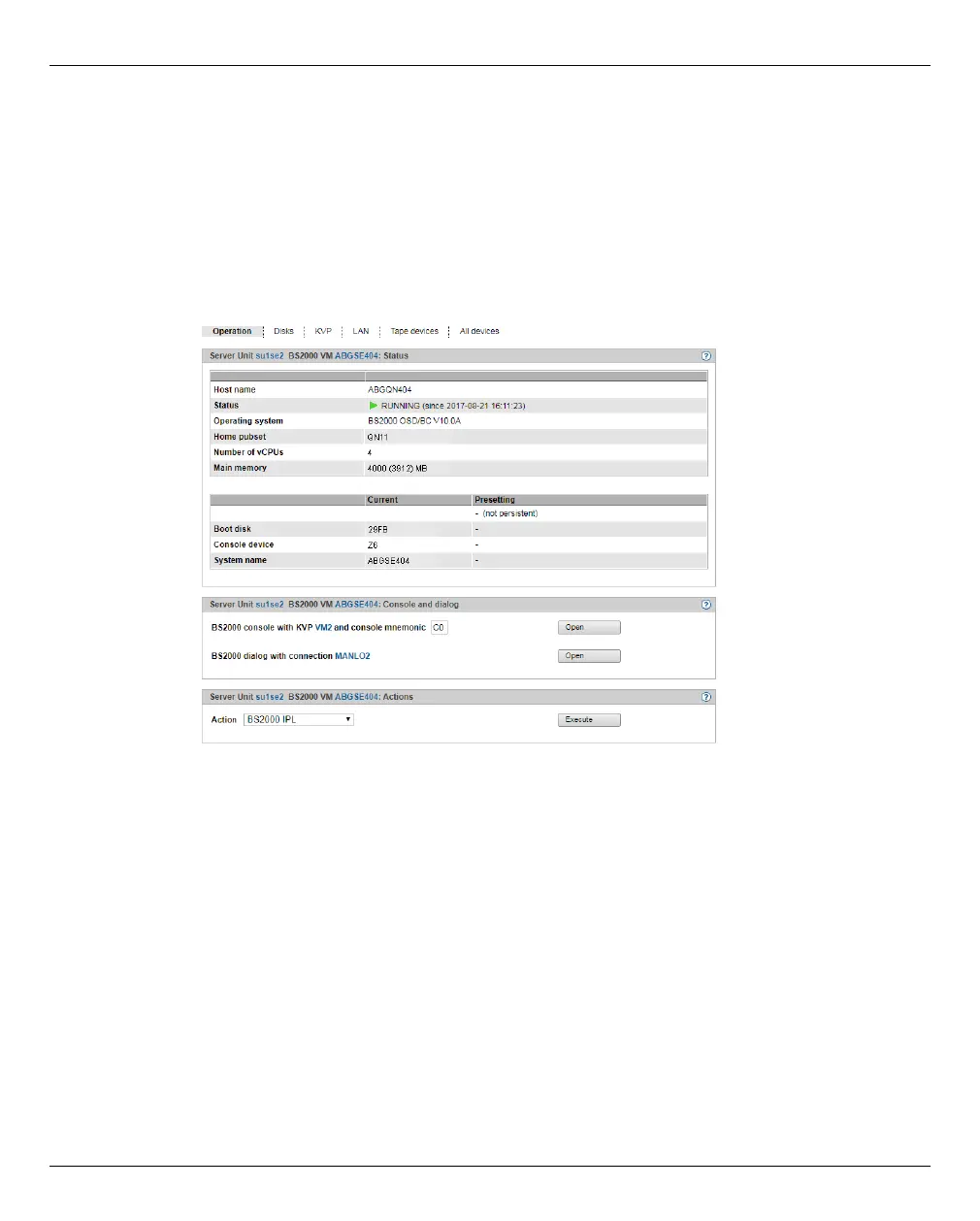 The Operation tab displays the status of the VM, offers access to the BS2000 console and