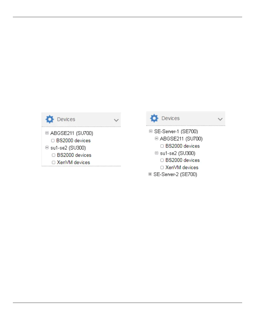 You manage the devices of the SE server using the Devices menu in the tree structure, see