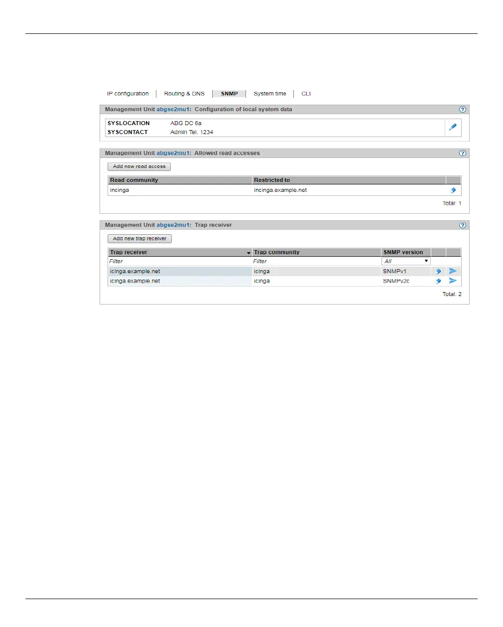 The SNMP tab displays information on the configuration of the local system data, allowed