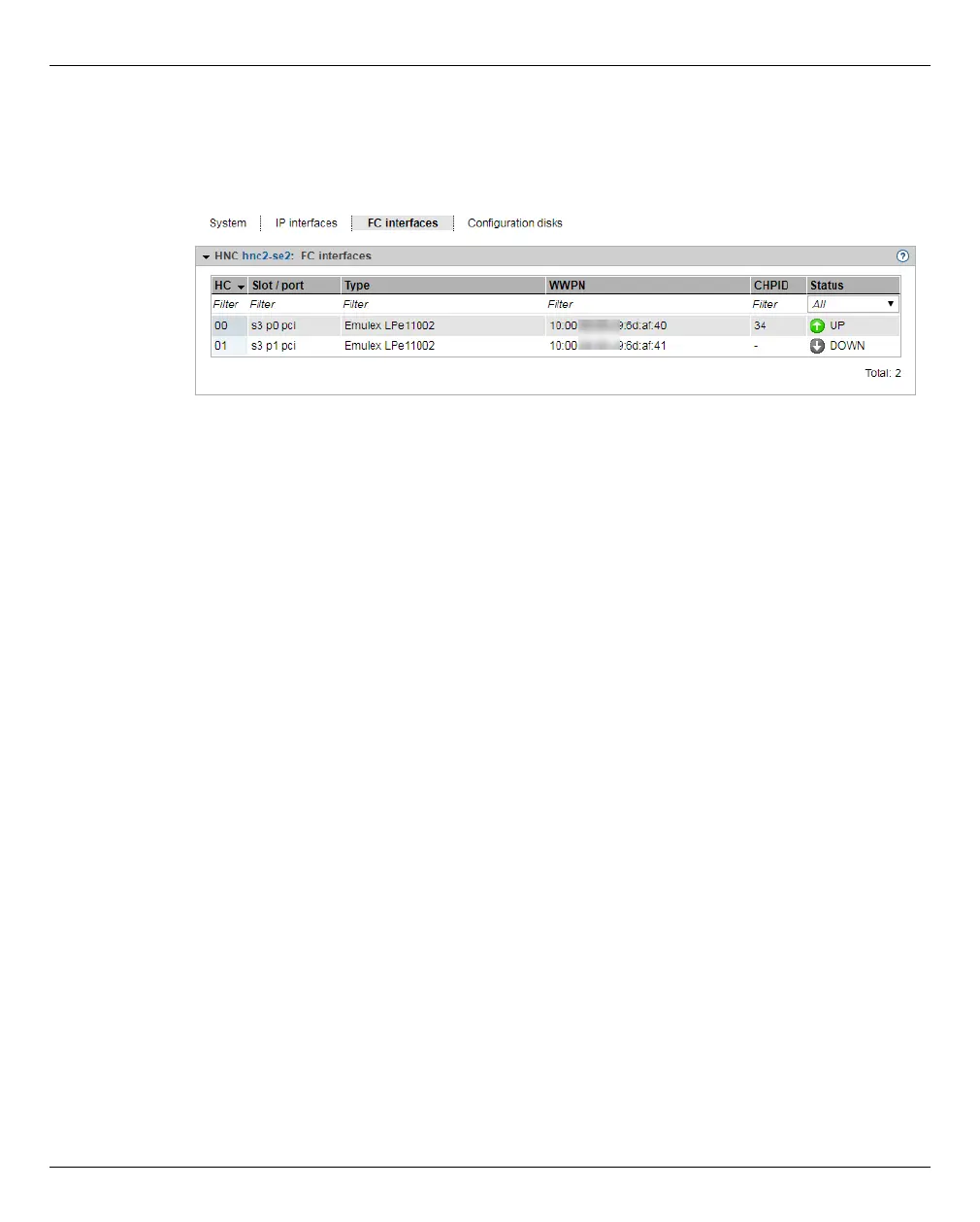 The FC interfaces tab provides information on the Fibre Channel interface of the HNC to the