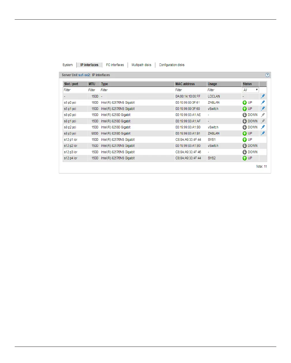 The IP interfaces tab provides information about the unit's LAN interfaces. The following