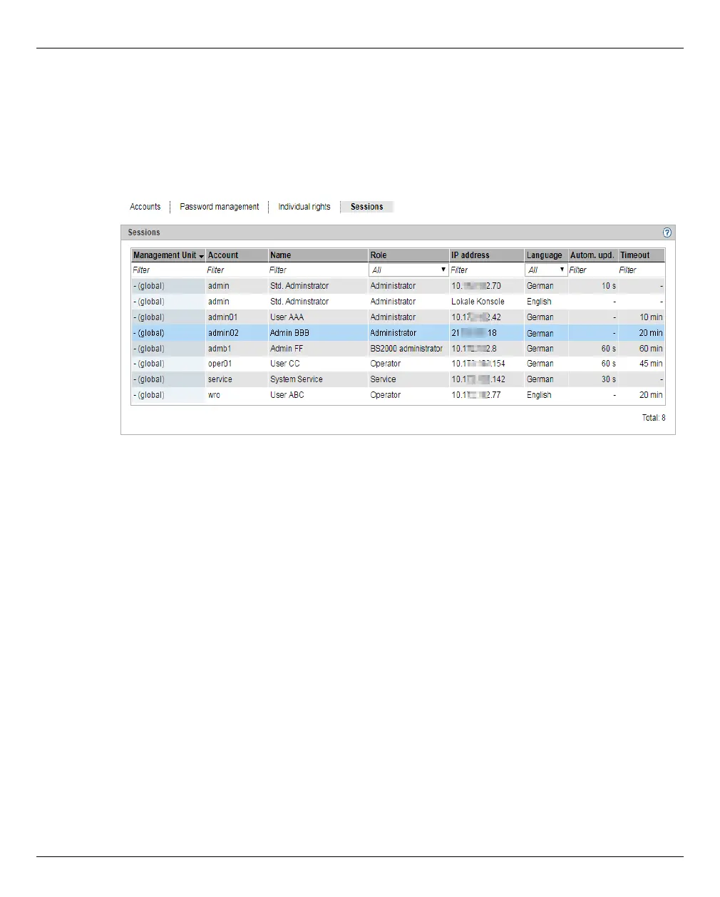 The Sessions tab informs the administrator about all sessions of users who are currently