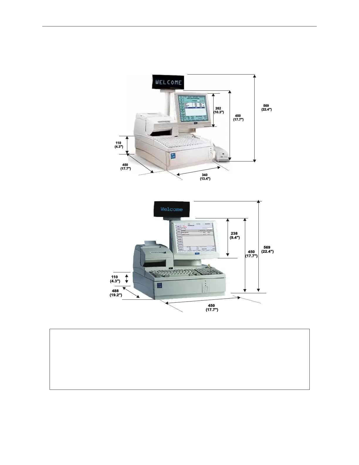 2. See cash drawer dimensions for configurations that include a cash drawer.
