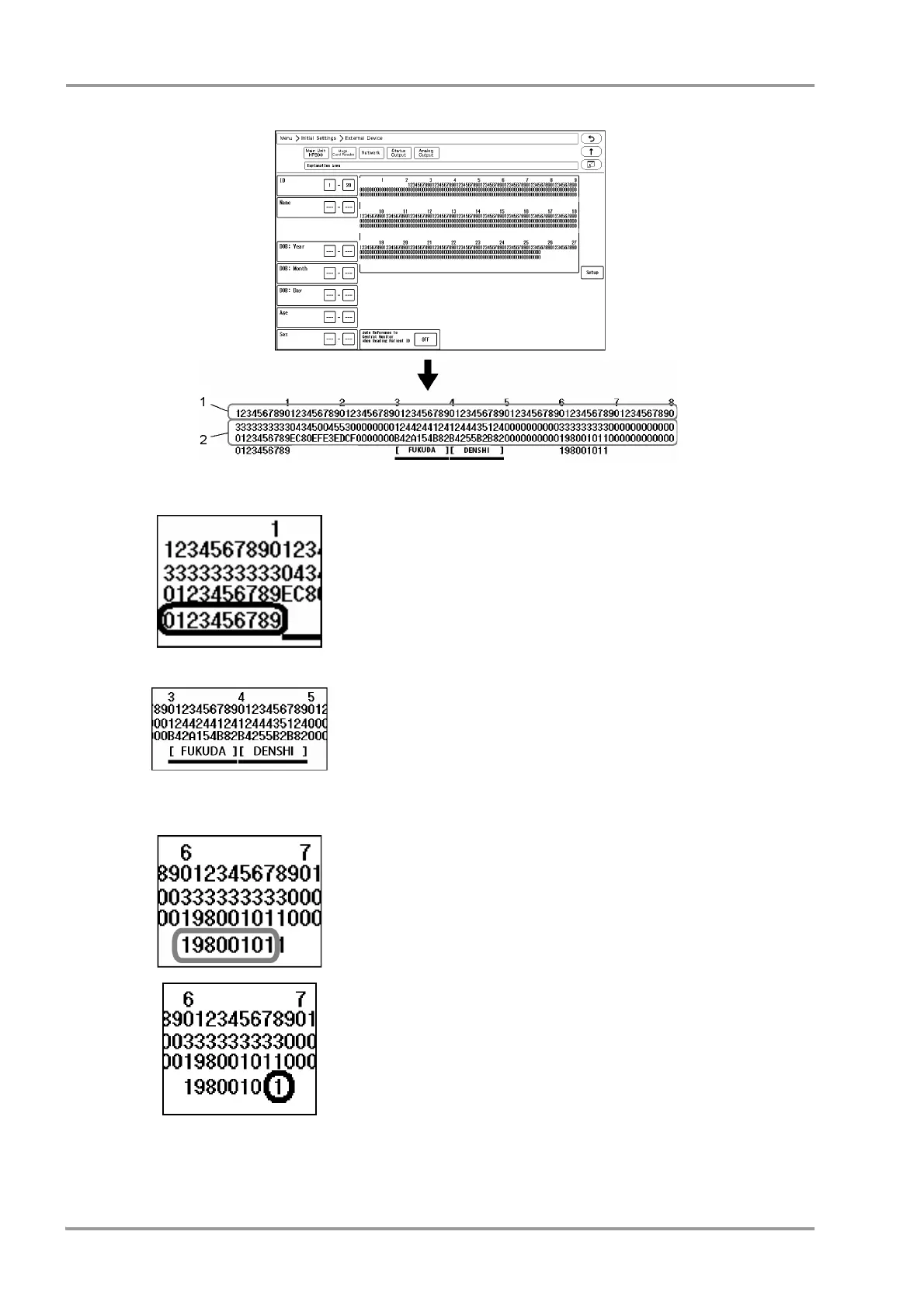 The patient name, "(Fukuda) (Denshi)" is displayed at 30th to 49th digit.