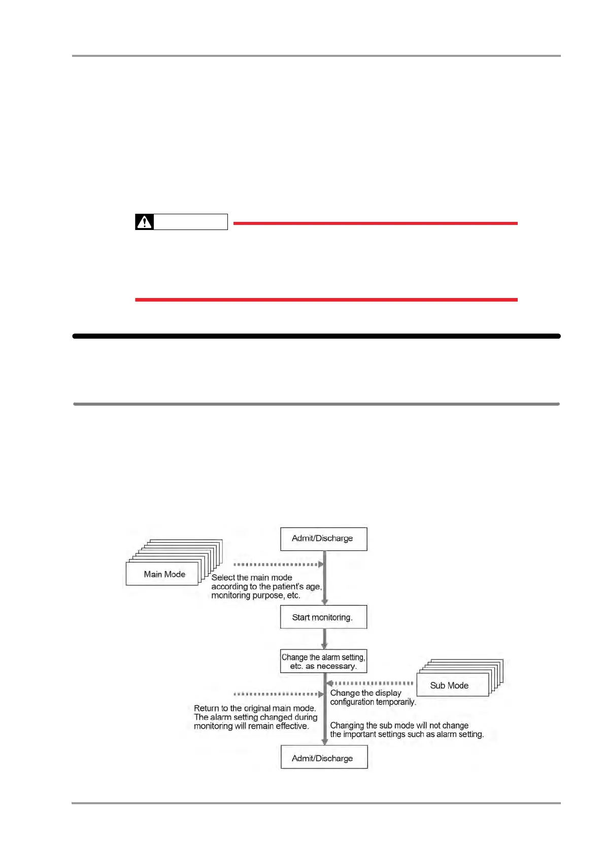 By programming the main mode, the alarm setups and display configuration setups at admittance of patient can be