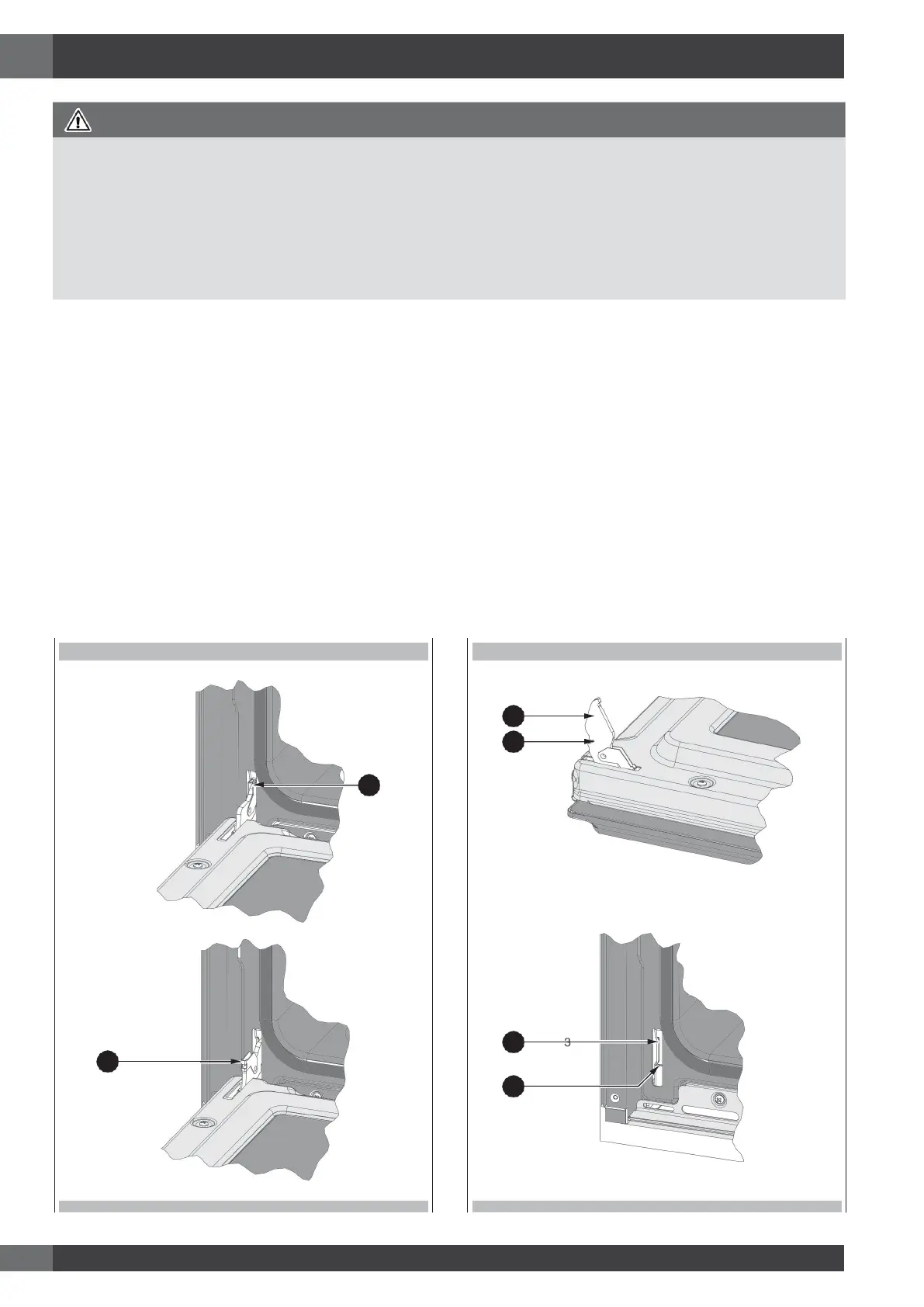 Insert the upper arms (2) of both hinges into the slots (3). The