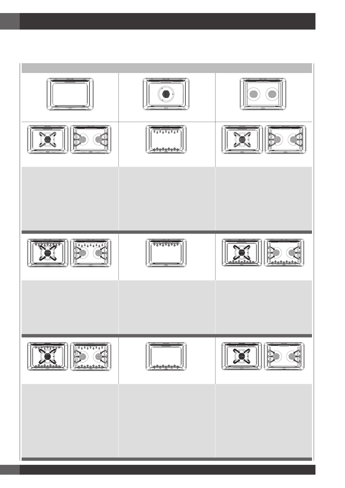 The following illustrations give an overview of what happens in the oven with each mode setting. The arrows represent the location