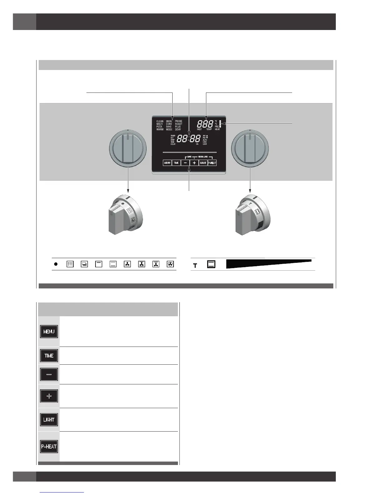 L’interfaccia utente presenta le seguenti caratteristiche: display, LED di preriscaldo, tasti di comando, manopola modalità di cottura