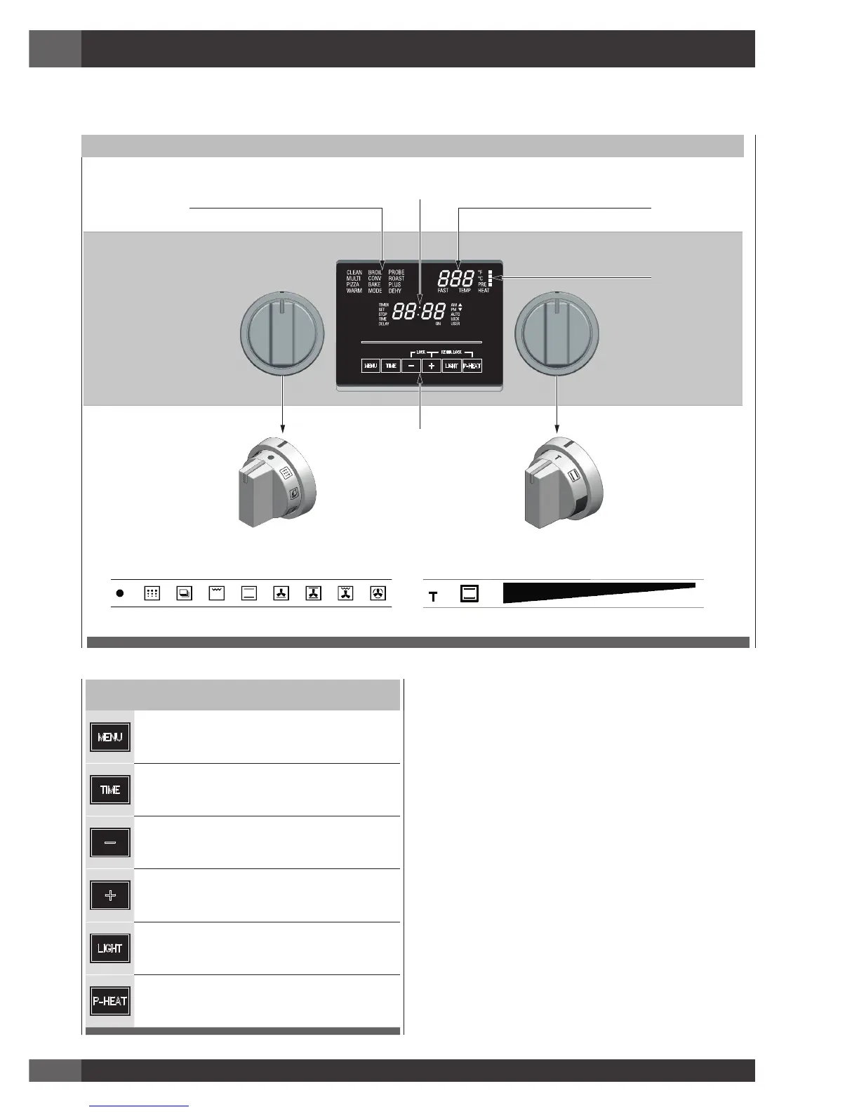 The user interface has the following features: display, preheat light indicators, keys for commands, cooking mode and temperature