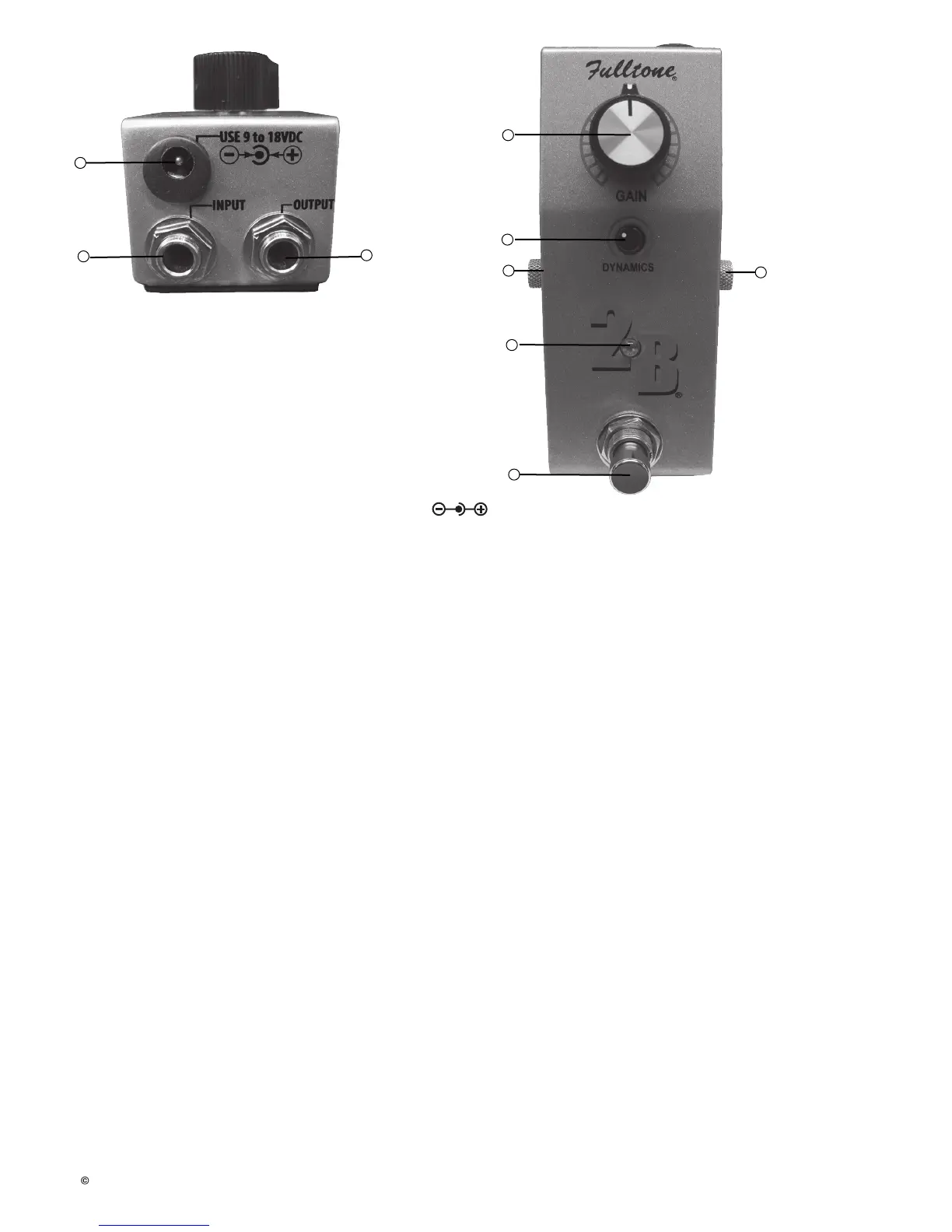 ON/OFF footswitch (#4): use this switch to turn the GAIN “boost” function on or off. When the LED (#5) is lit, you can adjust the volume “boost” using the GAIN knob. (#9)