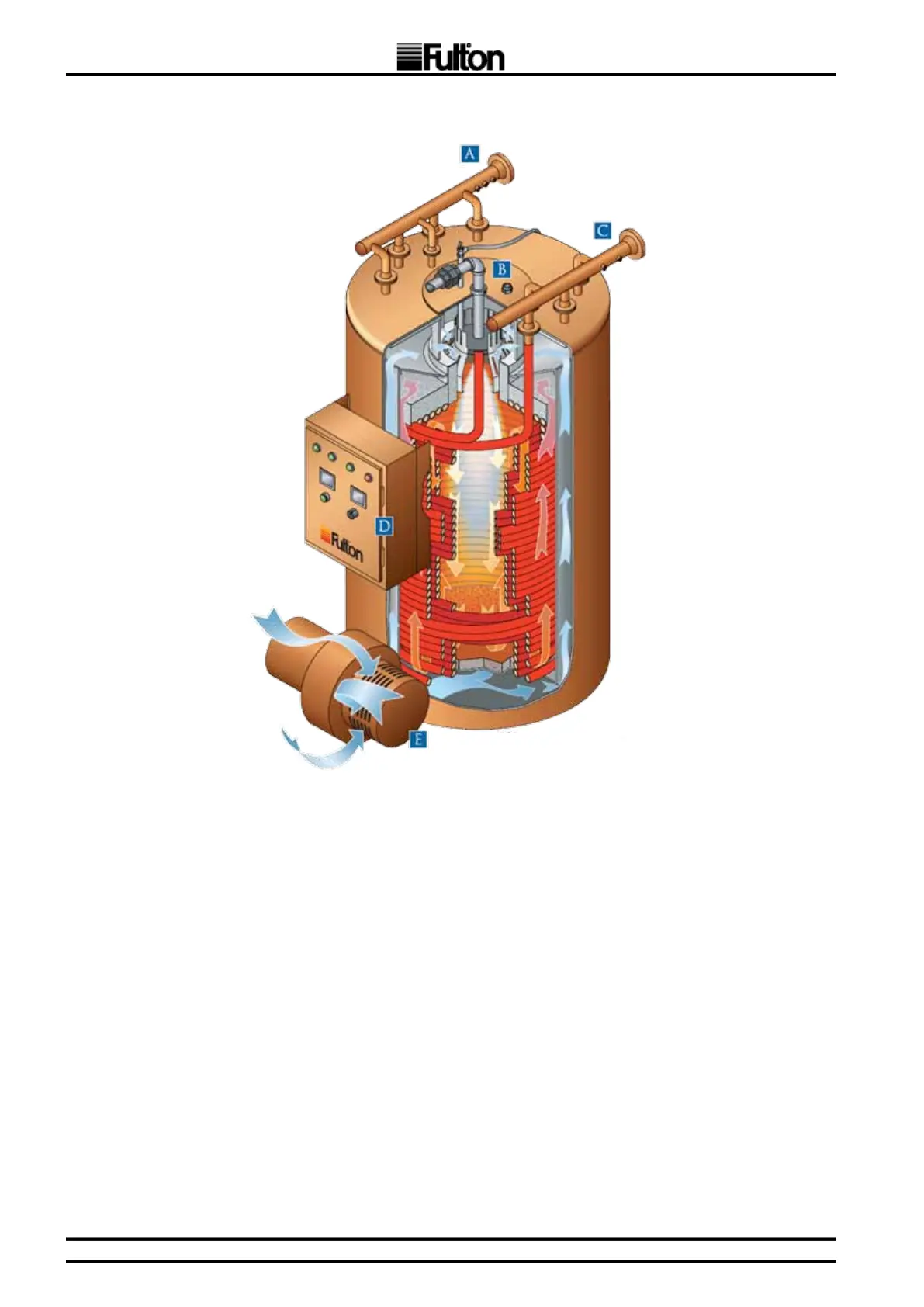 2. First pass (radiant): combustion air enters burner fan and travels upward between inner and