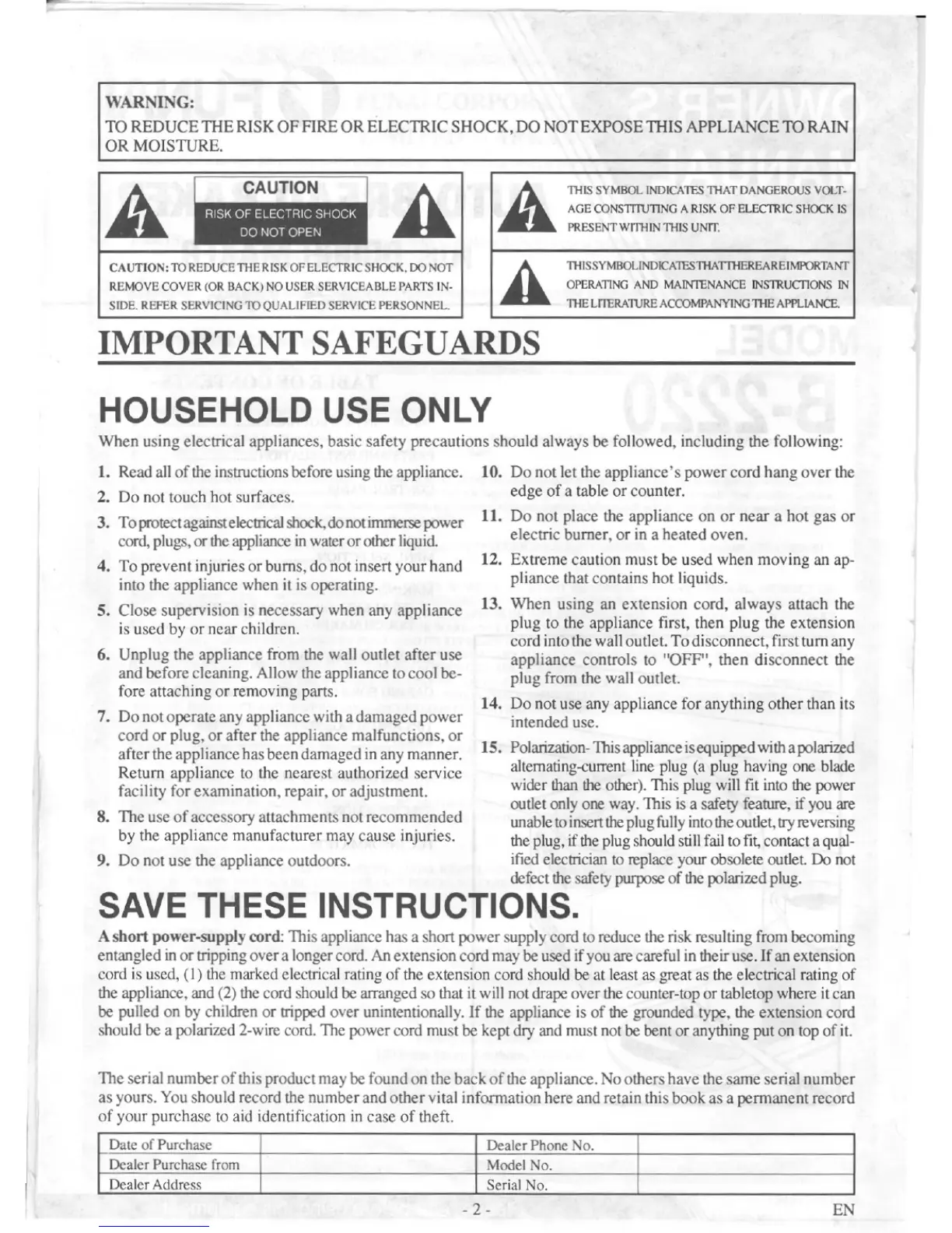 FUNAI B-2220 - Important Safeguards; Household Use Only Precautions