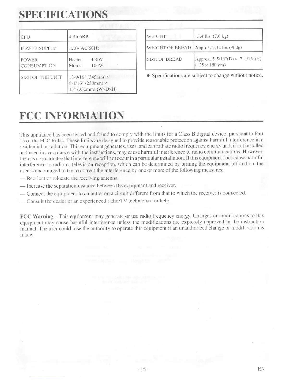 FUNAI B-4400 - Specifications; FCC Information