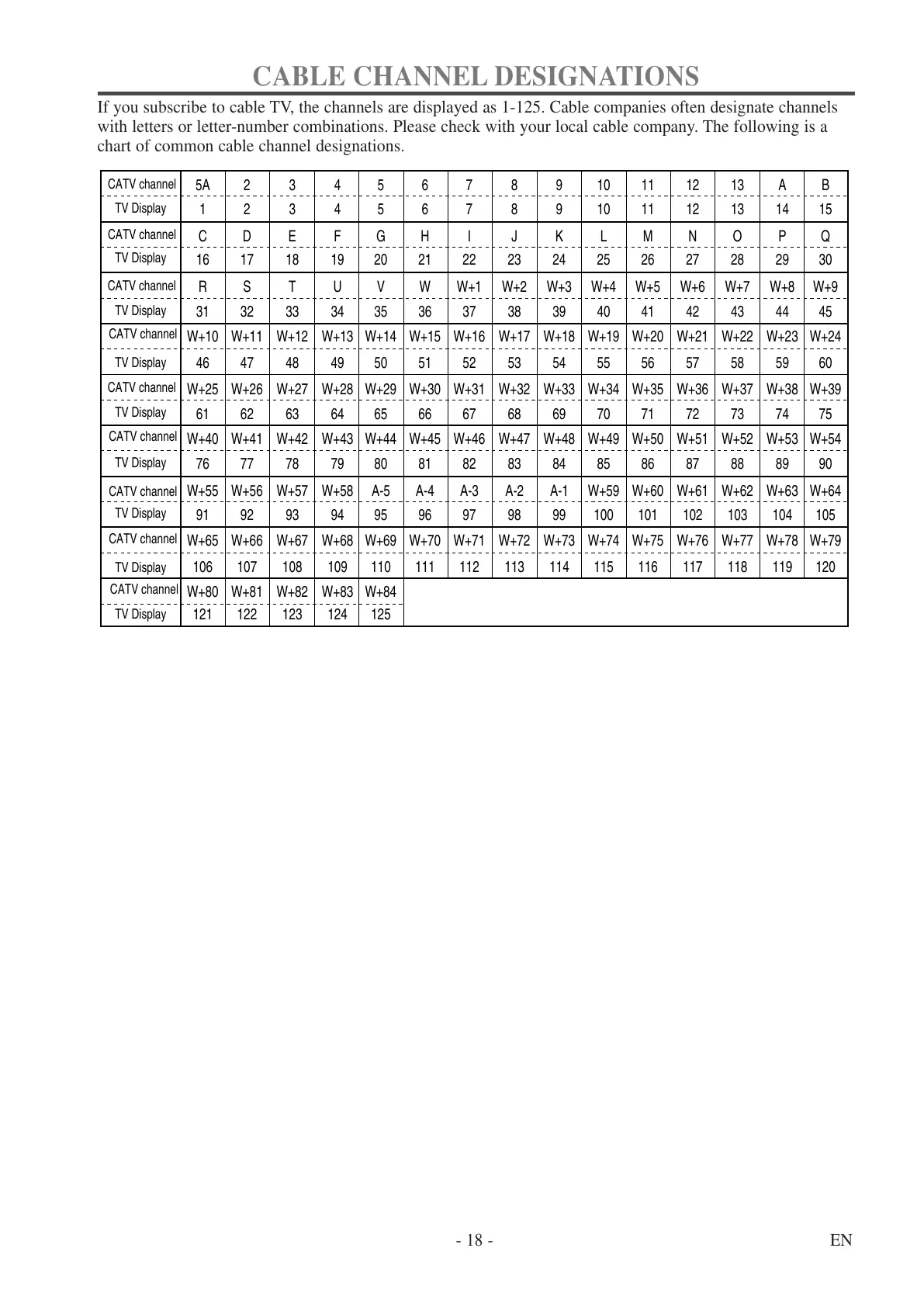with letters or letter-number combinations. Please check with your local cable company. The following is a
