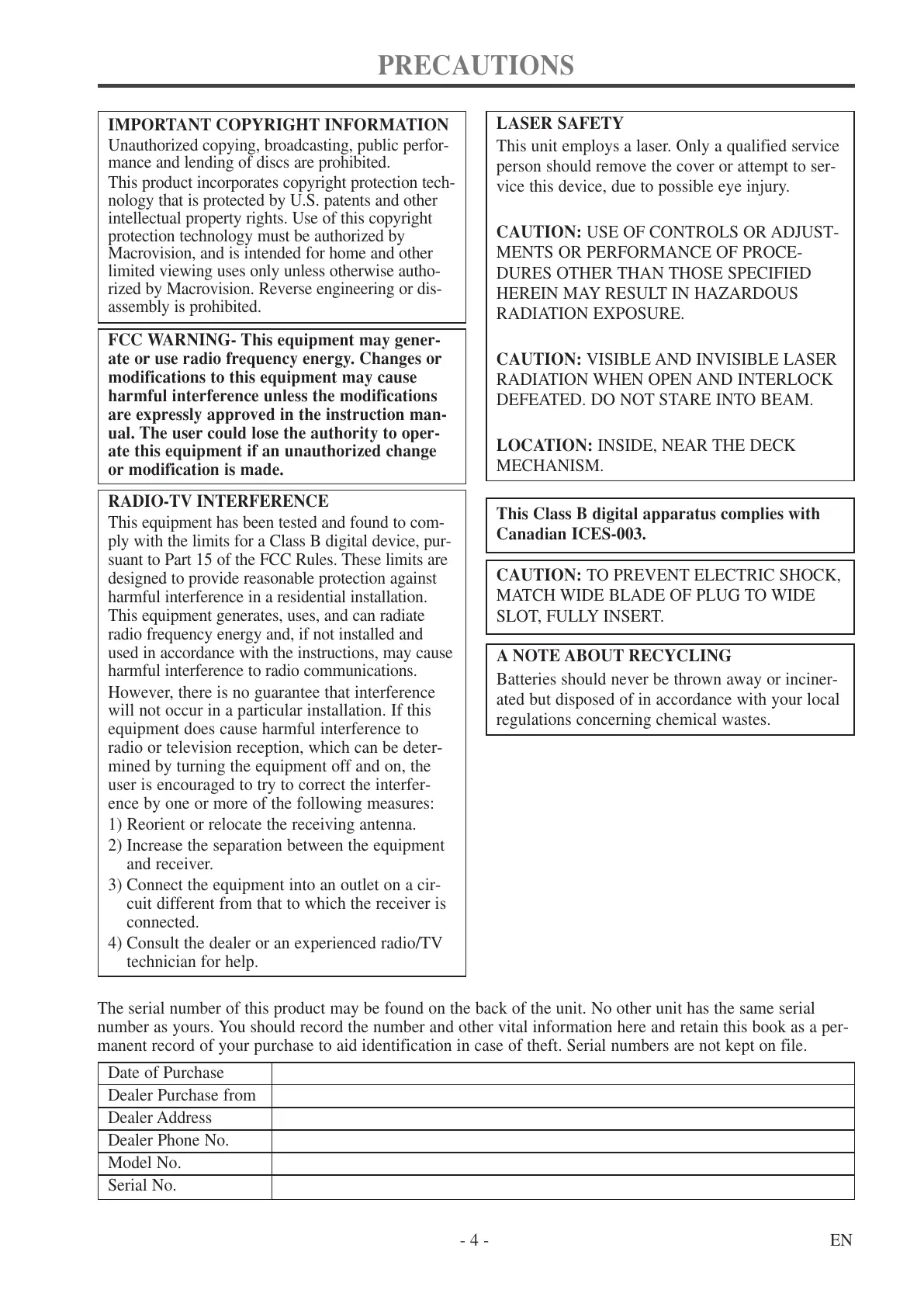 manent record of your purchase to aid identification in case of theft. Serial numbers are not kept on file.