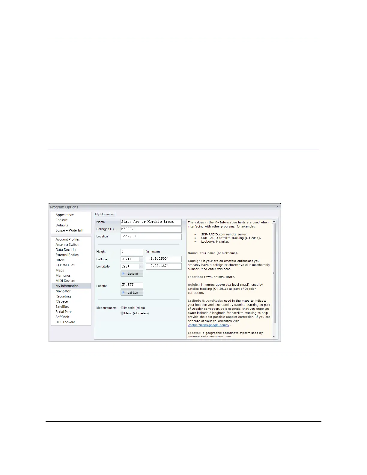 Select My Information (Lat, Lon …) from the Options dropdown in the FUNcube Dongle pane