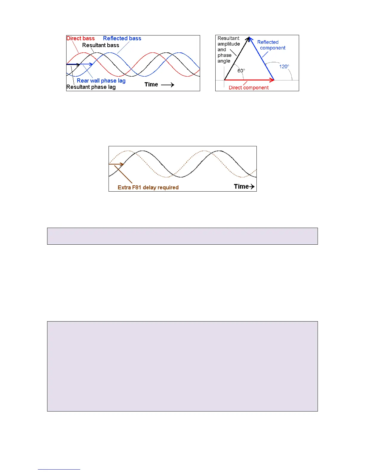 The simplified example shows the reflected bass (blue) arriving ⅓ wavelength (120°) later than the