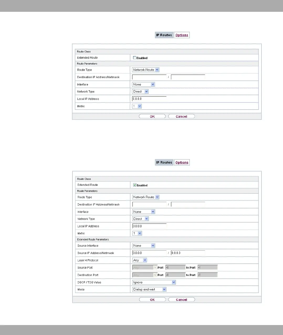 Fig. 72: Networking->Routes->IP Routes->New with Extended Route= not enabled.