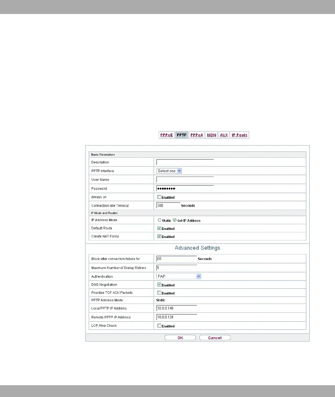 In this menu, you configure an Internet connection that uses the Point Tunnelling Protocol