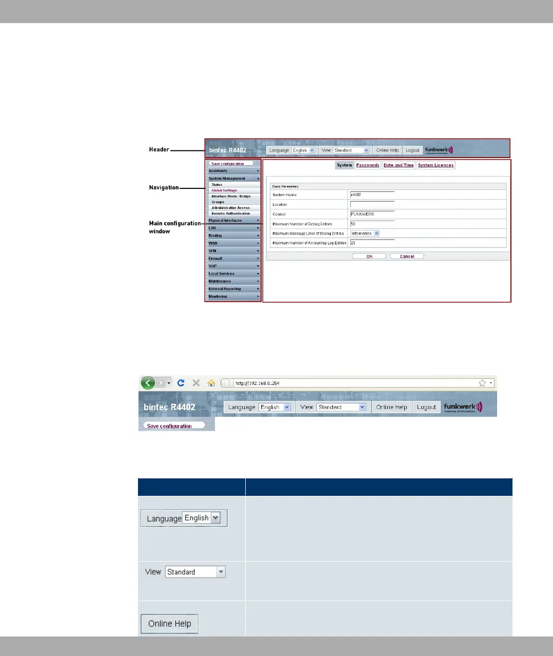 Fig. 21: Areas of the Funkwerk Configuration Interface