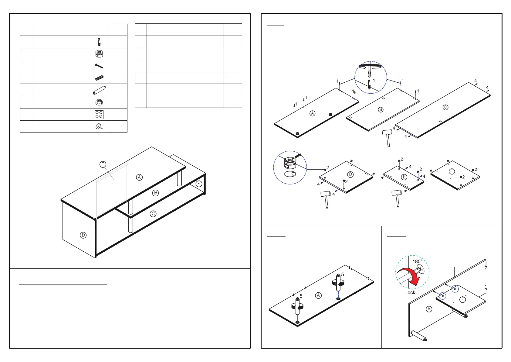 1.3 Insert Mini Fix Cam (2) and Nail Leg (8) into Panel (D,E&F), as shown.