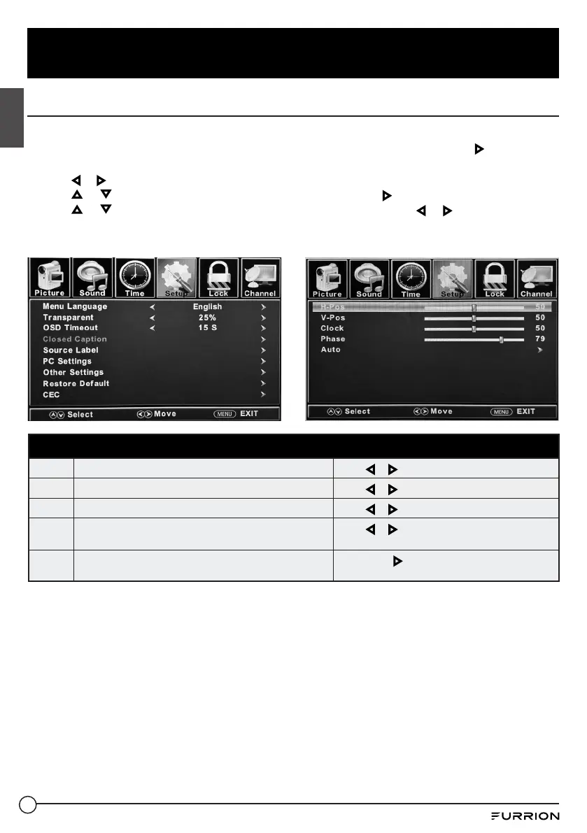 3. Use or to highlight PC Settings item , then press OK or to enter PC Menu table.